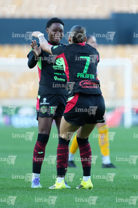 San Nicolás de los Garza, Nuevo León, 9 de febrero de 2026. Diana Ordoñez y Julitha Singano, durante el partido correspondiente a la jornada 8 del torneo Clausura 2026 de la Liga BBVA MX Femenil, entre las Tigres de la UANL y las Bravas de FC Juárez, realizado en el estadio Universitario. Foto: Imago7/ Andrea Jiménez