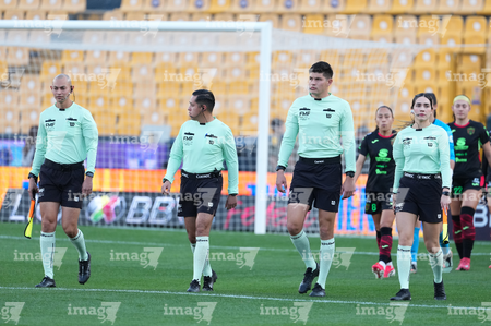 San Nicolás de los Garza, Nuevo León, 9 de febrero de 2026. Árbitros, durante el partido correspondiente a la jornada 8 del torneo Clausura 2026 de la Liga BBVA MX Femenil, entre las Tigres de la UANL y las Bravas de FC Juárez, realizado en el estadio Universitario. Foto: Imago7/ Andrea Jiménez