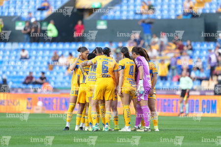 San Nicolás de los Garza, Nuevo León, 9 de febrero de 2026. Jugadoras de Tigres femenil, durante el partido correspondiente a la jornada 8 del torneo Clausura 2026 de la Liga BBVA MX Femenil, entre las Tigres de la UANL y las Bravas de FC Juárez, realizado en el estadio Universitario. Foto: Imago7/ Andrea Jiménez