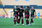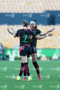 San Nicolás de los Garza, Nuevo León, 9 de febrero de 2026. Jugadoras del FC Juárez femenil en festejo de gol, durante el partido correspondiente a la jornada 8 del torneo Clausura 2026 de la Liga BBVA MX Femenil, entre las Tigres de la UANL y las Bravas de FC Juárez, realizado en el estadio Universitario. Foto: Imago7/ Andrea Jiménez