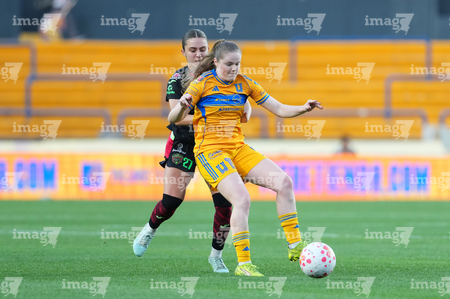 San Nicolás de los Garza, Nuevo León, 9 de febrero de 2026. Bianca Mora y Myra Delgadillo, durante el partido correspondiente a la jornada 8 del torneo Clausura 2026 de la Liga BBVA MX Femenil, entre las Tigres de la UANL y las Bravas de FC Juárez, realizado en el estadio Universitario. Foto: Imago7/ David Arzamendi