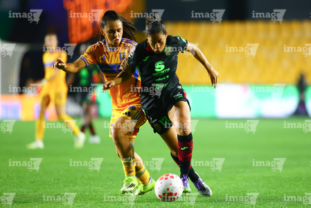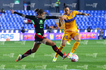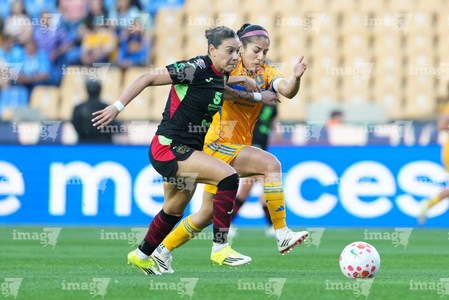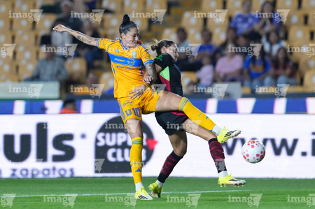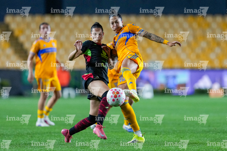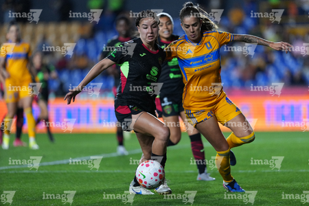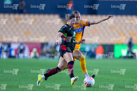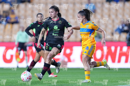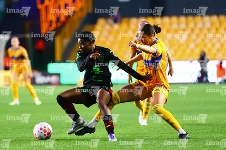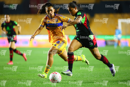 San Nicolás de los Garza, Nuevo León, 9 de febrero de 2026. Yunaira Lopez y Myra Delgadillo, durante el partido correspondiente a la jornada 8 del torneo Clausura 2026 de la Liga BBVA MX Femenil, entre las Tigres de la UANL y las Bravas de FC Juárez, realizado en el estadio Universitario. Foto: Imago7/ David Arzamendi