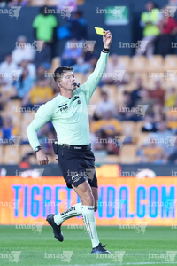 San Nicolás de los Garza, Nuevo León, 9 de febrero de 2026. Fernando Alexis Portillo, árbitro central muestra tarjeta amarilla de amonestación, durante el partido correspondiente a la jornada 8 del torneo Clausura 2026 de la Liga BBVA MX Femenil, entre las Tigres de la UANL y las Bravas de FC Juárez, realizado en el estadio Universitario. Foto: Imago7/ Andrea Jiménez