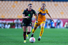 San Nicolás de los Garza, Nuevo León, 9 de febrero de 2026. Bianca Mora y Giselle Espinoza, durante el partido correspondiente a la jornada 8 del torneo Clausura 2026 de la Liga BBVA MX Femenil, entre las Tigres de la UANL y las Bravas de FC Juárez, realizado en el estadio Universitario. Foto: Imago7/ Andrea Jiménez