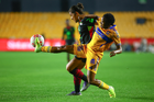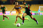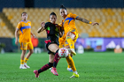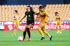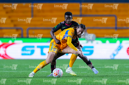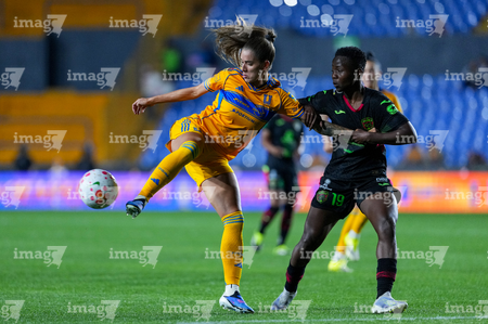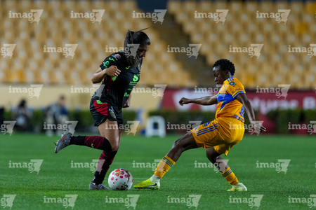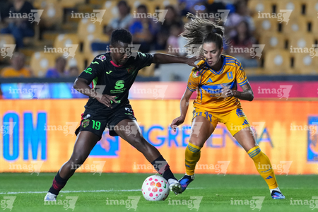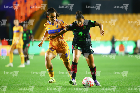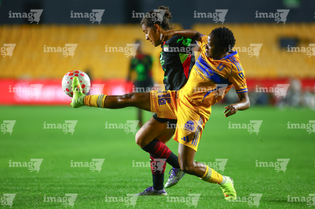 San Nicolás de los Garza, Nuevo León, 9 de febrero de 2026. Aisha Solorzano y Thembi Kgatlana, durante el partido correspondiente a la jornada 8 del torneo Clausura 2026 de la Liga BBVA MX Femenil, entre las Tigres de la UANL y las Bravas de FC Juárez, realizado en el estadio Universitario. Foto: Imago7/ David Arzamendi