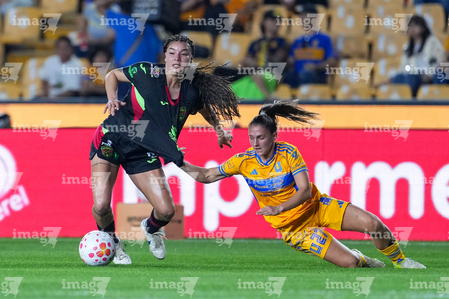 San Nicolás de los Garza, Nuevo León, 9 de febrero de 2026. Mariza Nascimento y Aisha Solorzano, durante el partido correspondiente a la jornada 8 del torneo Clausura 2026 de la Liga BBVA MX Femenil, entre las Tigres de la UANL y las Bravas de FC Juárez, realizado en el estadio Universitario. Foto: Imago7/ David Arzamendi