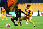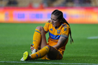 San Nicolás de los Garza, Nuevo León, 9 de febrero de 2026. Thembi Kgatlana en lamento, durante el partido correspondiente a la jornada 8 del torneo Clausura 2026 de la Liga BBVA MX Femenil, entre las Tigres de la UANL y las Bravas de FC Juárez, realizado en el estadio Universitario. Foto: Imago7/ Andrea Jiménez