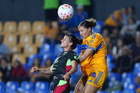 San Nicolás de los Garza, Nuevo León, 9 de febrero de 2026. Jenni Hermoso y Norma Palafox, durante el partido correspondiente a la jornada 8 del torneo Clausura 2026 de la Liga BBVA MX Femenil, entre las Tigres de la UANL y las Bravas de FC Juárez, realizado en el estadio Universitario. Foto: Imago7/ Andrea Jiménez