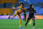 San Nicolás de los Garza, Nuevo León, 9 de febrero de 2026. Julitha Singano y Jheniffer Cordinali, durante el partido correspondiente a la jornada 8 del torneo Clausura 2026 de la Liga BBVA MX Femenil, entre las Tigres de la UANL y las Bravas de FC Juárez, realizado en el estadio Universitario. Foto: Imago7/ Andrea Jiménez