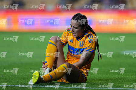 San Nicolás de los Garza, Nuevo León, 9 de febrero de 2026. Diana Ordoñez resultó lesionada, durante el partido correspondiente a la jornada 8 del torneo Clausura 2026 de la Liga BBVA MX Femenil, entre las Tigres de la UANL y las Bravas de FC Juárez, realizado en el estadio Universitario. Foto: Imago7/ Andrea Jiménez