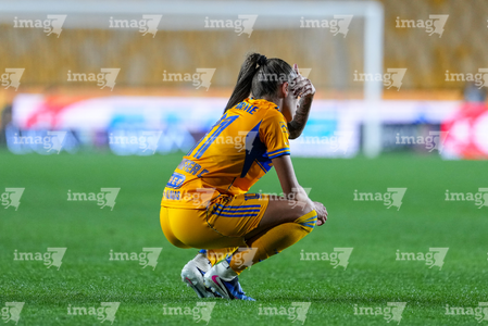 San Nicolás de los Garza, Nuevo León, 9 de febrero de 2026. Jheniffer Cordinali en lamento, durante el partido correspondiente a la jornada 8 del torneo Clausura 2026 de la Liga BBVA MX Femenil, entre las Tigres de la UANL y las Bravas de FC Juárez, realizado en el estadio Universitario. Foto: Imago7/ Andrea Jiménez