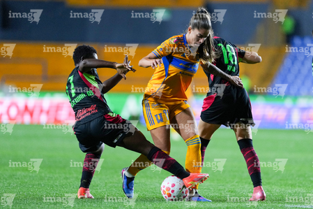 San Nicolás de los Garza, Nuevo León, 9 de febrero de 2026. Grace Asantewaa, Jheniffer Cordinali y Aurelie Kaci, durante el partido correspondiente a la jornada 8 del torneo Clausura 2026 de la Liga BBVA MX Femenil, entre las Tigres de la UANL y las Bravas de FC Juárez, realizado en el estadio Universitario. Foto: Imago7/ Andrea Jiménez