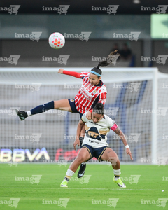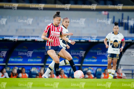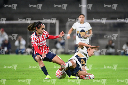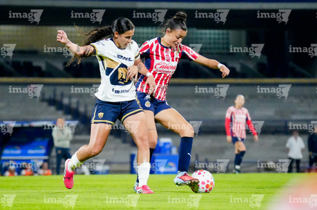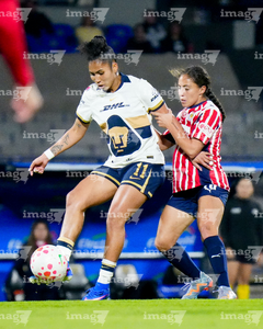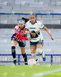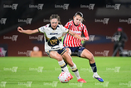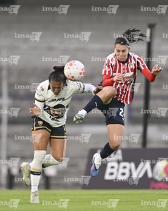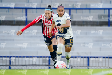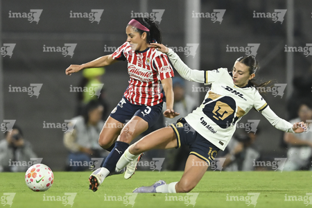 Ciudad de México, 9 de febrero de 2026. Liced Serna y Denise Castro, durante el partido correspondiente a la jornada 8 del torneo Clausura 2026 de la Liga BBVA MX Femenil, entre las Pumas de la UNAM y las Chivas Rayadas del Guadalajara, realizado en el estadio Olímpico Universitario. Foto: Imago7/ Diego Padilla