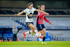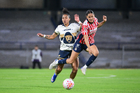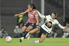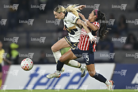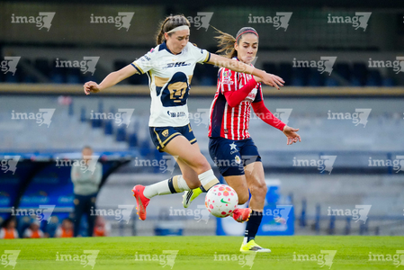 Ciudad de México, 9 de febrero de 2026. Nayely Bolaños y Eva González, durante el partido correspondiente a la jornada 8 del torneo Clausura 2026 de la Liga BBVA MX Femenil, entre las Pumas de la UNAM y las Chivas Rayadas del Guadalajara, realizado en el estadio Olímpico Universitario. Foto: Imago7/ Diego Padilla