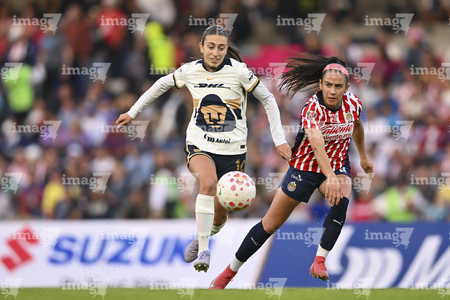 Ciudad de México, 9 de febrero de 2026. Gabriela Valenzuela y Paola Chavero, durante el partido correspondiente a la jornada 8 del torneo Clausura 2026 de la Liga BBVA MX Femenil, entre las Pumas de la UNAM y las Chivas Rayadas del Guadalajara, realizado en el estadio Olímpico Universitario. Foto: Imago7/ Diego Padilla