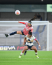 Ciudad de México, 9 de febrero de 2026. Gabriela Valenzuela y Wendy Bonilla, durante el partido correspondiente a la jornada 8 del torneo Clausura 2026 de la Liga BBVA MX Femenil, entre las Pumas de la UNAM y las Chivas Rayadas del Guadalajara, realizado en el estadio Olímpico Universitario. Foto: Imago7/ Alexis Chavez