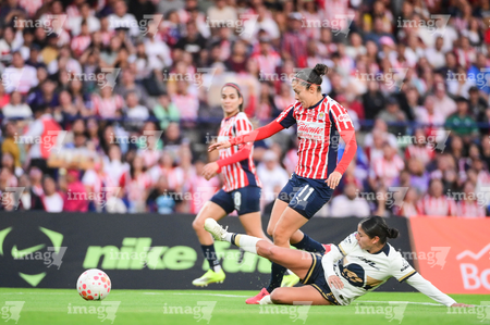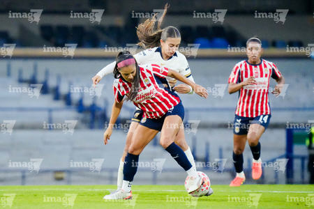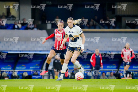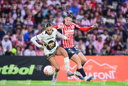 Ciudad de México, 9 de febrero de 2026. Nayely Bolaños y Denise Castro, durante el partido correspondiente a la jornada 8 del torneo Clausura 2026 de la Liga BBVA MX Femenil, entre las Pumas de la UNAM y las Chivas Rayadas del Guadalajara, realizado en el estadio Olímpico Universitario. Foto: Imago7/ Alexis Chavez