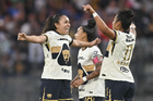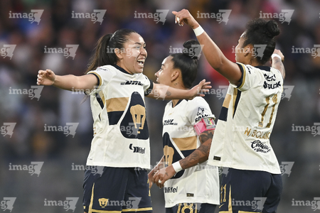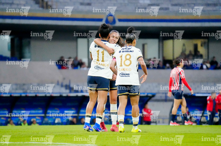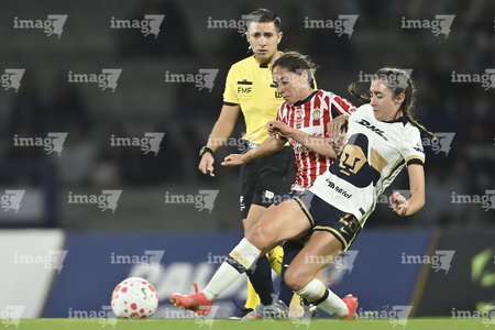 Ciudad de México, 9 de febrero de 2026. Ariatna Dorantes, Damaris Godínez y Paola Chavero, durante el partido correspondiente a la jornada 8 del torneo Clausura 2026 de la Liga BBVA MX Femenil, entre las Pumas de la UNAM y las Chivas Rayadas del Guadalajara, realizado en el estadio Olímpico Universitario. Foto: Imago7/Etzel Espinosa