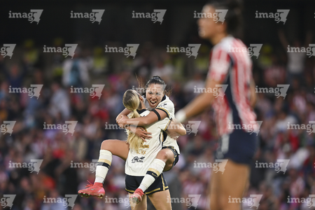 Ciudad de México, 9 de febrero de 2026. Eva González y Silvana Flores, durante el partido correspondiente a la jornada 8 del torneo Clausura 2026 de la Liga BBVA MX Femenil, entre las Pumas de la UNAM y las Chivas Rayadas del Guadalajara, realizado en el estadio Olímpico Universitario. Foto: Imago7/Etzel Espinosa