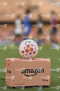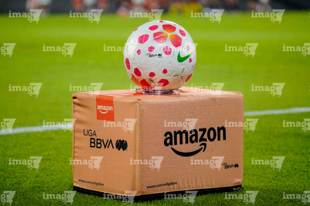 Ciudad de México, 9 de febrero de 2026. Balón de futbol Nike Control sobre caja de Amazon, durante el partido correspondiente a la jornada 8 del torneo Clausura 2026 de la Liga BBVA MX Femenil, entre las Pumas de la UNAM y las Chivas Rayadas del Guadalajara, realizado en el estadio Olímpico Universitario. Foto: Imago7/ Alexis Chavez
