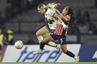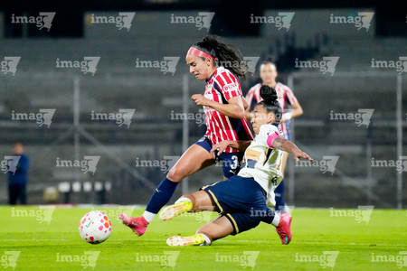 Ciudad de México, 9 de febrero de 2026. Montserrat Hernández y Carolina Jaramillo, durante el partido correspondiente a la jornada 8 del torneo Clausura 2026 de la Liga BBVA MX Femenil, entre las Pumas de la UNAM y las Chivas Rayadas del Guadalajara, realizado en el estadio Olímpico Universitario. Foto: Imago7/Etzel Espinosa