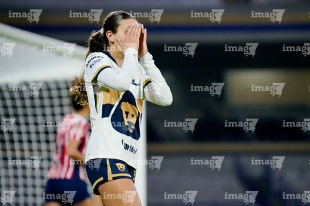 Ciudad de México, 9 de febrero de 2026. Cristina Torres en lamento, durante el partido correspondiente a la jornada 8 del torneo Clausura 2026 de la Liga BBVA MX Femenil, entre las Pumas de la UNAM y las Chivas Rayadas del Guadalajara, realizado en el estadio Olímpico Universitario. Foto: Imago7/ Diego Padilla