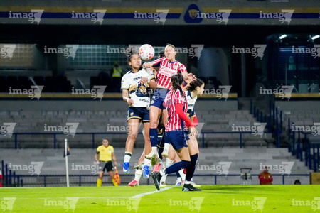 Ciudad de México, 9 de febrero de 2026. Heidi González, Mar Moya y Jashia López, durante el partido correspondiente a la jornada 8 del torneo Clausura 2026 de la Liga BBVA MX Femenil, entre las Pumas de la UNAM y las Chivas Rayadas del Guadalajara, realizado en el estadio Olímpico Universitario. Foto: Imago7/ Alexis Chavez