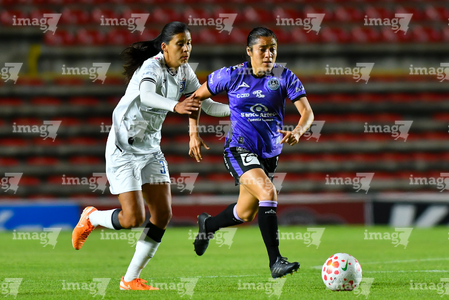 Querétaro, Querétaro, 9 de febrero de 2026. Lucy Ortiz y Laisha Espinosa, durante el partido correspondiente a la jornada 8 del torneo Clausura 2026 de la Liga BBVA MX Femenil, entre el Club Querétaro y las Cañoneras del Mazatlán FC, realizado en el estadio La Corregidora. Foto: Imago7/ Olimpia Puga
