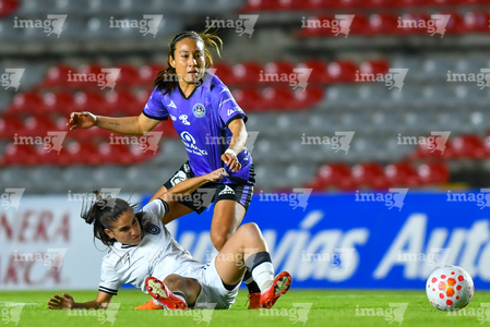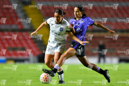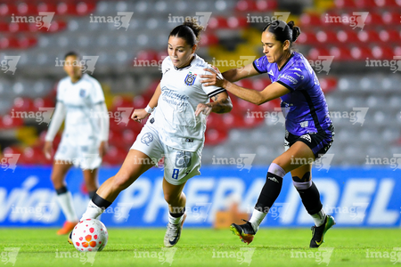 Querétaro, Querétaro, 9 de febrero de 2026. Karen De León y Guillermina Grant, durante el partido correspondiente a la jornada 8 del torneo Clausura 2026 de la Liga BBVA MX Femenil, entre el Club Querétaro y las Cañoneras del Mazatlán FC, realizado en el estadio La Corregidora. Foto: Imago7/ Olimpia Puga