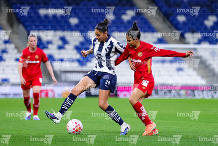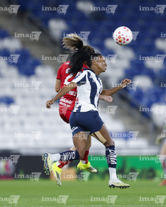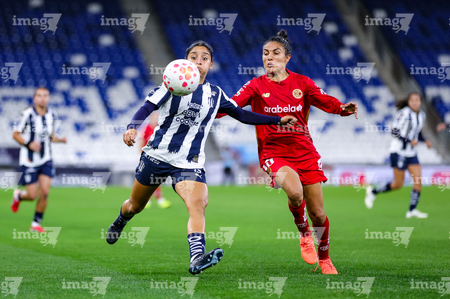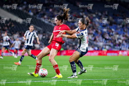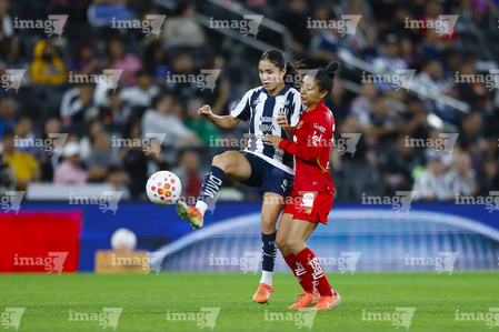 Guadalupe, Nuevo León, 9 de febrero de 2026. Karla Martínez y Allison Veloz, durante el partido correspondiente a la jornada 8 del torneo Clausura 2026 de la Liga BBVA MX Femenil, entre las Rayadas del Monterrey y las Diablas Rojas del Toluca, realizado en el estadio BBVA. Foto: Imago7/ Nora Pamela