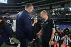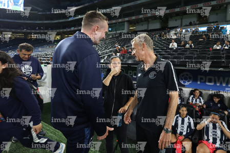 Guadalupe, Nuevo León, 9 de febrero de 2026. Amandine Miquel, directora técnica y Patrice Lair, director técnico, durante el partido correspondiente a la jornada 8 del torneo Clausura 2026 de la Liga BBVA MX Femenil, entre las Rayadas del Monterrey y las Diablas Rojas del Toluca, realizado en el estadio BBVA. Foto: Imago7/