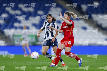 Guadalupe, Nuevo León, 9 de febrero de 2026. Sofía Martínez y Casandra Cuevas, durante el partido correspondiente a la jornada 8 del torneo Clausura 2026 de la Liga BBVA MX Femenil, entre las Rayadas del Monterrey y las Diablas Rojas del Toluca, realizado en el estadio BBVA. Foto: Imago7/