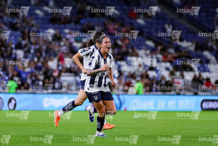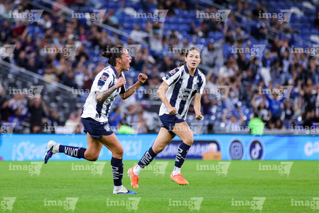 Guadalupe, Nuevo León, 9 de febrero de 2026. Diana García y Marcela Restrepo en festejo de gol, durante el partido correspondiente a la jornada 8 del torneo Clausura 2026 de la Liga BBVA MX Femenil, entre las Rayadas del Monterrey y las Diablas Rojas del Toluca, realizado en el estadio BBVA. Foto: Imago7/ Nora Pamela
