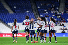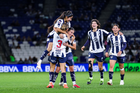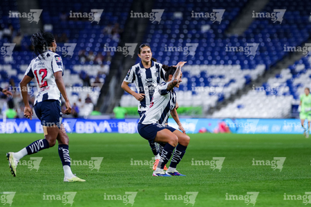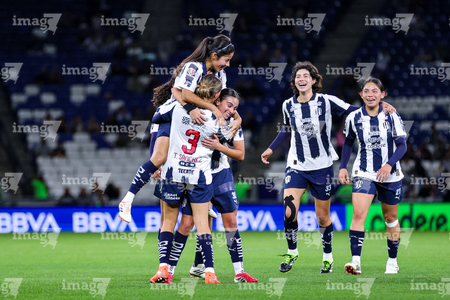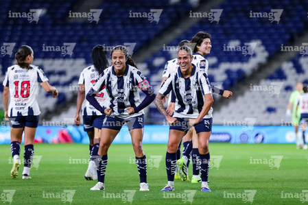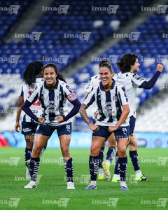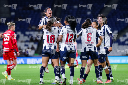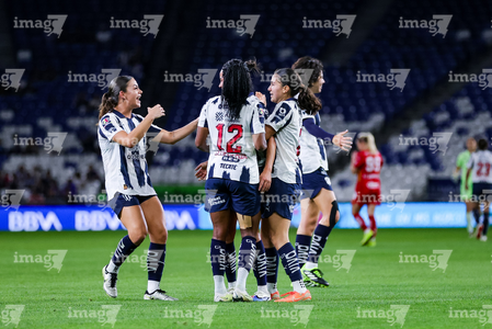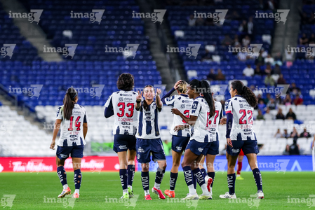 Guadalupe, Nuevo León, 9 de febrero de 2026. Jugadoras de Rayadas en festejo de gol, durante el partido correspondiente a la jornada 8 del torneo Clausura 2026 de la Liga BBVA MX Femenil, entre las Rayadas del Monterrey y las Diablas Rojas del Toluca, realizado en el estadio BBVA. Foto: Imago7/ Nora Pamela