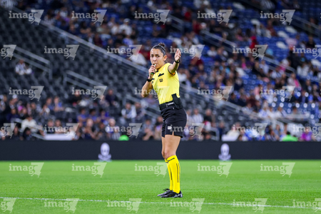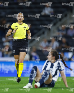 Guadalupe, Nuevo León, 9 de febrero de 2026. Ana Paola Hernández, árbitra central, durante el partido correspondiente a la jornada 8 del torneo Clausura 2026 de la Liga BBVA MX Femenil, entre las Rayadas del Monterrey y las Diablas Rojas del Toluca, realizado en el estadio BBVA. Foto: Imago7/