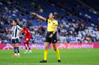 Guadalupe, Nuevo León, 9 de febrero de 2026. Ana Paola Hernández, árbitra central, durante el partido correspondiente a la jornada 8 del torneo Clausura 2026 de la Liga BBVA MX Femenil, entre las Rayadas del Monterrey y las Diablas Rojas del Toluca, realizado en el estadio BBVA. Foto: Imago7/ Nora Pamela