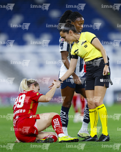 Guadalupe, Nuevo León, 9 de febrero de 2026. Eugenie Le Sommer y Ana Paola Hernández, árbitra central, durante el partido correspondiente a la jornada 8 del torneo Clausura 2026 de la Liga BBVA MX Femenil, entre las Rayadas del Monterrey y las Diablas Rojas del Toluca, realizado en el estadio BBVA. Foto: Imago7/