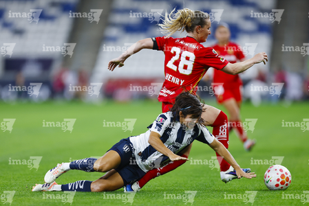 Guadalupe, Nuevo León, 9 de febrero de 2026. Sofía Martínez y Amandine Henry, durante el partido correspondiente a la jornada 8 del torneo Clausura 2026 de la Liga BBVA MX Femenil, entre las Rayadas del Monterrey y las Diablas Rojas del Toluca, realizado en el estadio BBVA. Foto: Imago7/