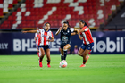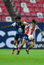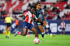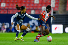 San Luis Potosí, San Luis Potosí, 10 de febrero de 2026. Andrea Pereira y Amina Bello, durante el partido correspondiente a la jornada 8 del torneo Clausura 2026 de la Liga BBVA MX Femenil, entre el Atlético San Luis y las Tuzas del Pachuca, realizado en el estadio Libertad Financiera. Foto: Imago7/ Hugo Martinez