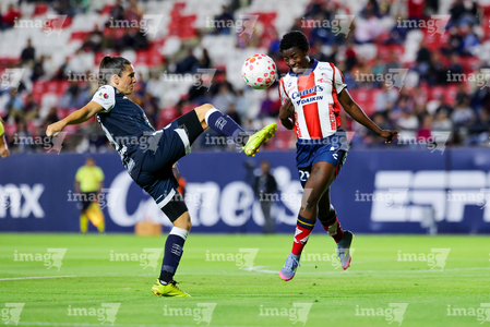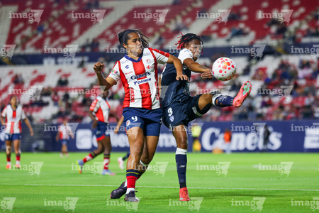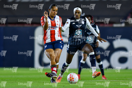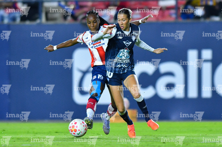 San Luis Potosí, San Luis Potosí, 10 de febrero de 2026. Amina Bello y Yirleidis Quejada, durante el partido correspondiente a la jornada 8 del torneo Clausura 2026 de la Liga BBVA MX Femenil, entre el Atlético San Luis y las Tuzas del Pachuca, realizado en el estadio Libertad Financiera. Foto: Imago7/ Hugo Martinez
