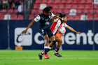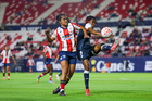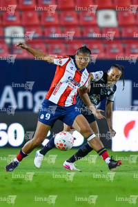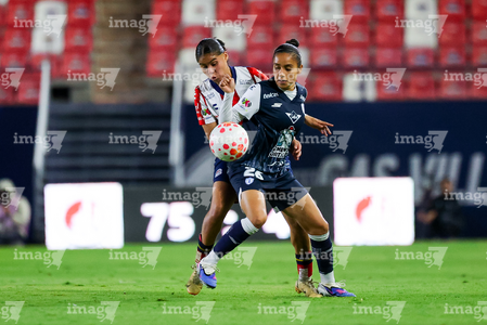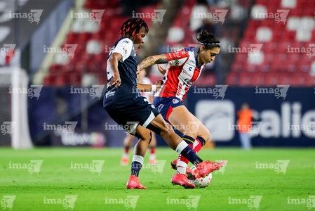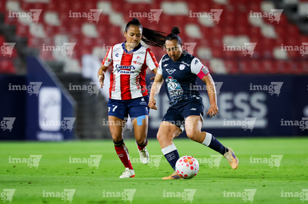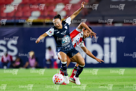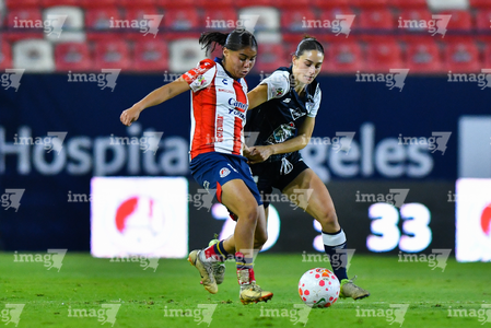 San Luis Potosí, San Luis Potosí, 10 de febrero de 2026. Alexandra Godínez y Yirleidis Quejada, durante el partido correspondiente a la jornada 8 del torneo Clausura 2026 de la Liga BBVA MX Femenil, entre el Atlético San Luis y las Tuzas del Pachuca, realizado en el estadio Libertad Financiera. Foto: Imago7/ Olimpia Puga