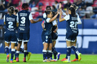 San Luis Potosí, San Luis Potosí, 10 de febrero de 2026. Jugadoras de Tuzas en festejo de gol, durante el partido correspondiente a la jornada 8 del torneo Clausura 2026 de la Liga BBVA MX Femenil, entre el Atlético San Luis y las Tuzas del Pachuca, realizado en el estadio Libertad Financiera. Foto: Imago7/ Olimpia Puga