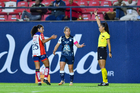 San Luis Potosí, San Luis Potosí, 10 de febrero de 2026. Nina Nicosia y Carmen Lopez, durante el partido correspondiente a la jornada 8 del torneo Clausura 2026 de la Liga BBVA MX Femenil, entre el Atlético San Luis y las Tuzas del Pachuca, realizado en el estadio Libertad Financiera. Foto: Imago7/ Olimpia Puga
