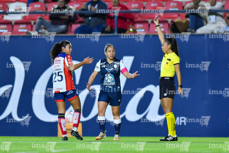 San Luis Potosí, San Luis Potosí, 10 de febrero de 2026. Diana Velázquez Lomelí, árbitra central, muestra tarjeta roja de expulsión, durante el partido correspondiente a la jornada 8 del torneo Clausura 2026 de la Liga BBVA MX Femenil, entre el Atlético San Luis y las Tuzas del Pachuca, realizado en el estadio Libertad Financiera. Foto: Imago7/ Olimpia Puga