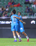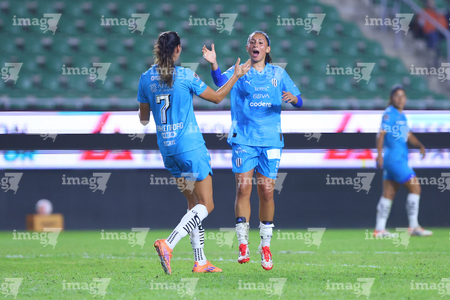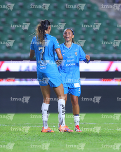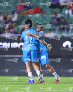 Mazatlán, Sinaloa, 12 de marzo de 2026. Lucía García y Alice Soto en festejo de gol, durante el partido correspondiente a la jornada 11 del torneo Clausura 2026 de la Liga BBVA MX Femenil, entre las Cañoneras del Mazatlán FC y las Rayadas del Monterrey, realizado en el estadio El Encanto. Foto: Imago7/ Juan Carlos Cubeyro.
