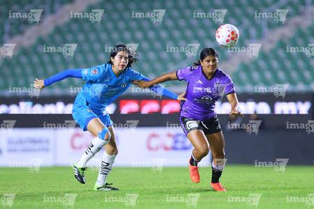 Mazatlán, Sinaloa, 12 de marzo de 2026. Valerie Vargas y María Canseco, durante el partido correspondiente a la jornada 11 del torneo Clausura 2026 de la Liga BBVA MX Femenil, entre las Cañoneras del Mazatlán FC y las Rayadas del Monterrey, realizado en el estadio El Encanto. Foto: Imago7/ Juan Carlos Cubeyro.