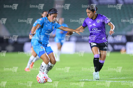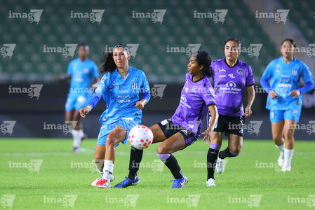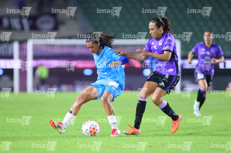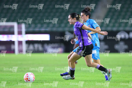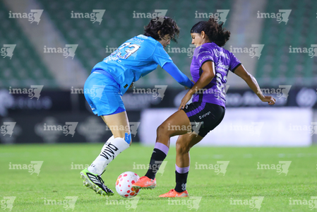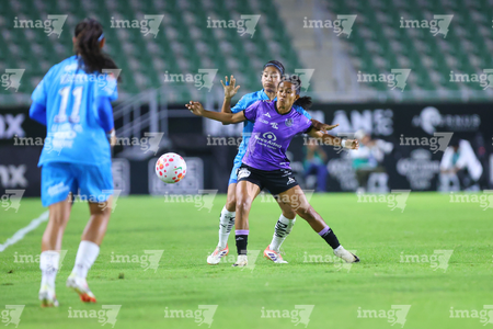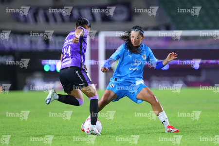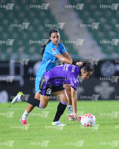 Mazatlán, Sinaloa, 12 de marzo de 2026. Brenda Aleman y Daniela Monrroy, durante el partido correspondiente a la jornada 11 del torneo Clausura 2026 de la Liga BBVA MX Femenil, entre las Cañoneras del Mazatlán FC y las Rayadas del Monterrey, realizado en el estadio El Encanto. Foto: Imago7/ Juan Carlos Cubeyro.