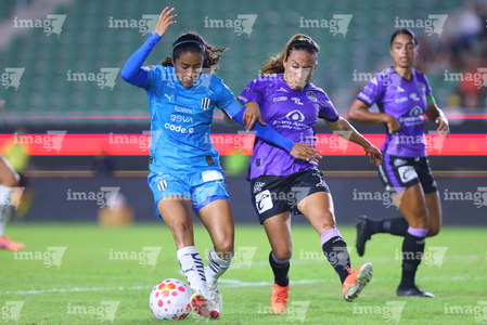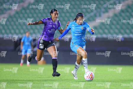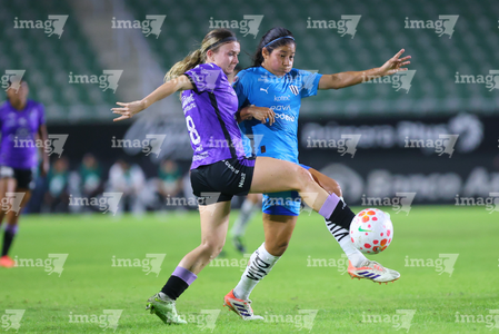 Mazatlán, Sinaloa, 12 de marzo de 2026. Brenda Aleman y Lucía García, durante el partido correspondiente a la jornada 11 del torneo Clausura 2026 de la Liga BBVA MX Femenil, entre las Cañoneras del Mazatlán FC y las Rayadas del Monterrey, realizado en el estadio El Encanto. Foto: Imago7/ Juan Carlos Cubeyro.