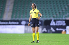 Mazatlán, Sinaloa, 12 de marzo de 2026. María Fernanda Márquez, árbitro central, durante el partido correspondiente a la jornada 11 del torneo Clausura 2026 de la Liga BBVA MX Femenil, entre las Cañoneras del Mazatlán FC y las Rayadas del Monterrey, realizado en el estadio El Encanto. Foto: Imago7/ Juan Carlos Cubeyro.