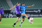 Mazatlán, Sinaloa, 12 de marzo de 2026. Alice Soto y Daniela García, durante el partido correspondiente a la jornada 11 del torneo Clausura 2026 de la Liga BBVA MX Femenil, entre las Cañoneras del Mazatlán FC y las Rayadas del Monterrey, realizado en el estadio El Encanto. Foto: Imago7/ Juan Carlos Cubeyro.